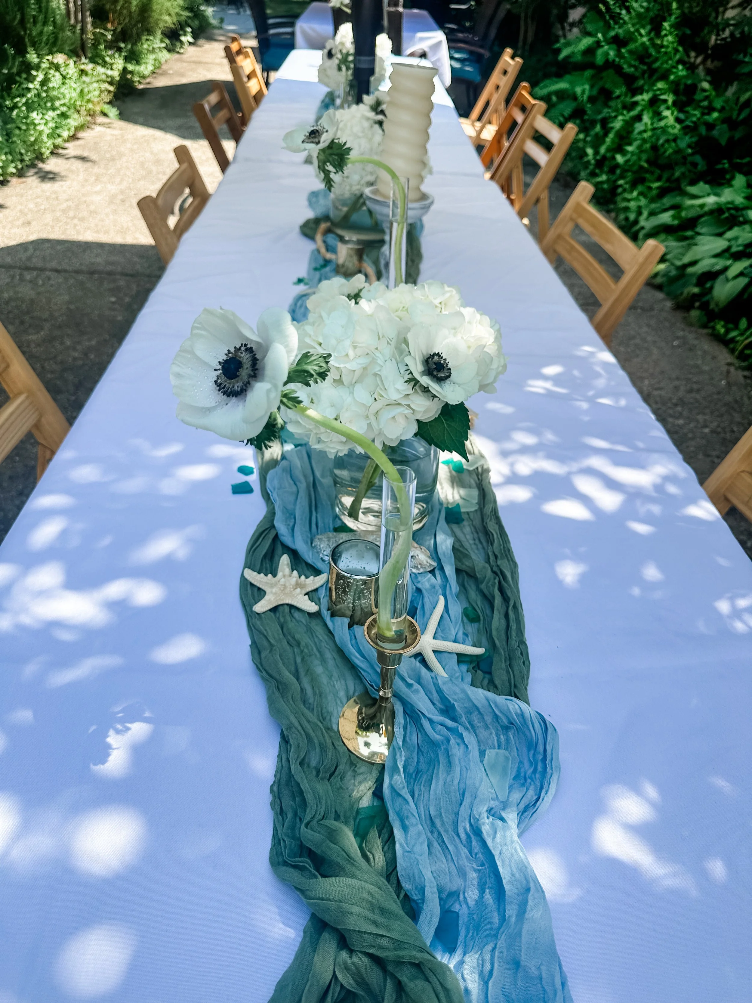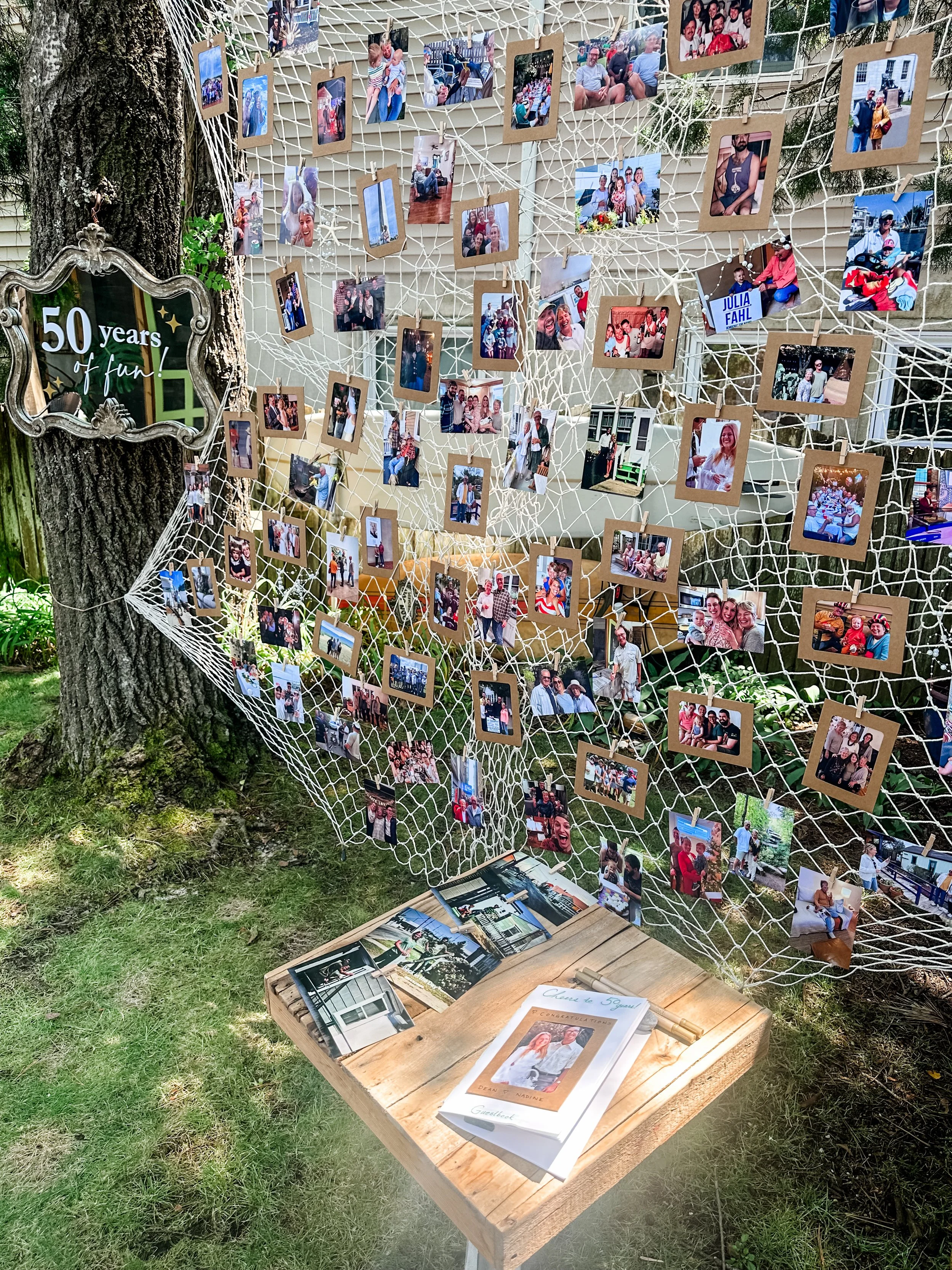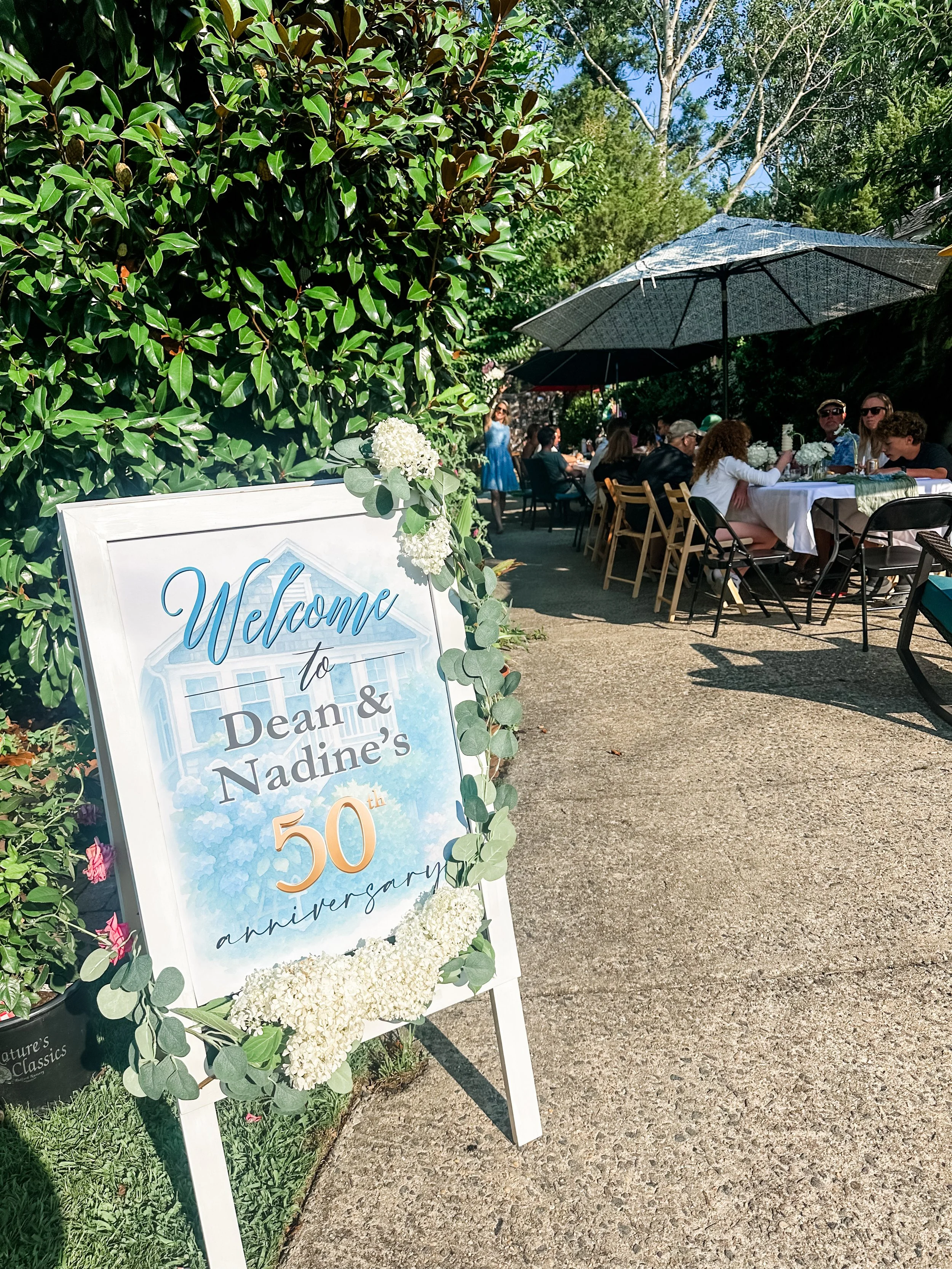 The theme was more around a color scheme and “vibe” of sea glass and hydrangeas which fit the coastal property perfectly. Tablescapes were draped in blue and green gauze with hydrangea bushels and single animones in custom test tube candlesticks throughout. We welcomed guests with a custom A-Frame sign with a watercolor print of their home and Limelight Hydrangea accents. The feature of the party was a large fish net that we strung between trees and clipped dozens of pictures throughout the past 50 years- all of family and friends, many who were at the party! Removable vinyl was used to create the “50 Years of Fun” mirror which was a perfect precursor to the display.