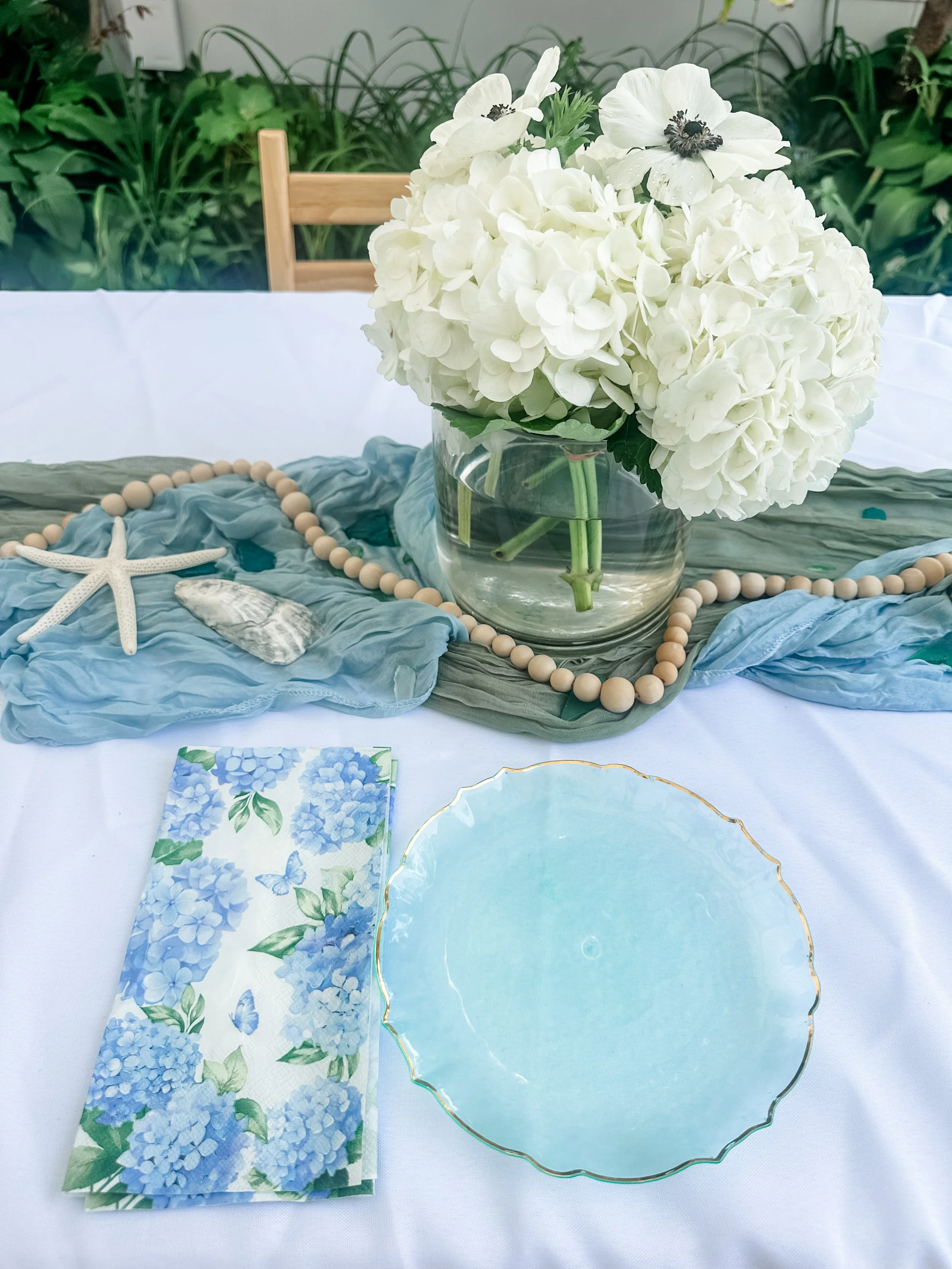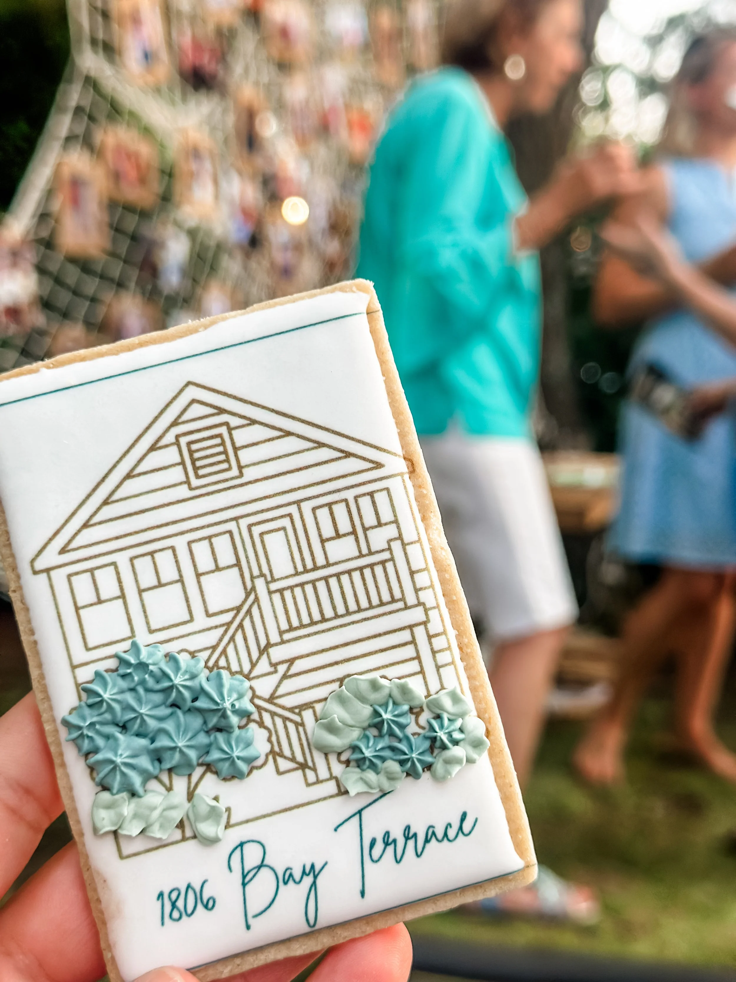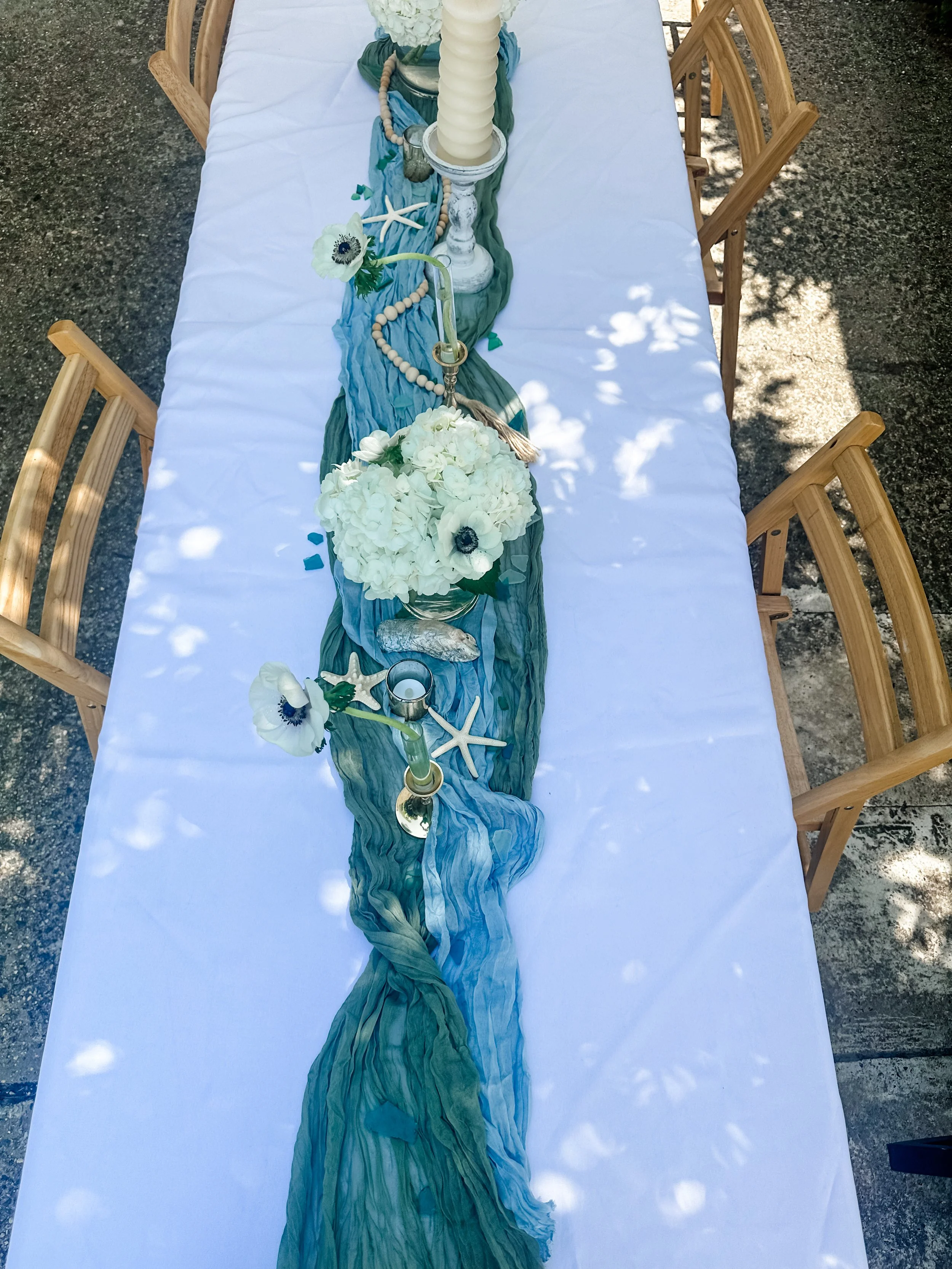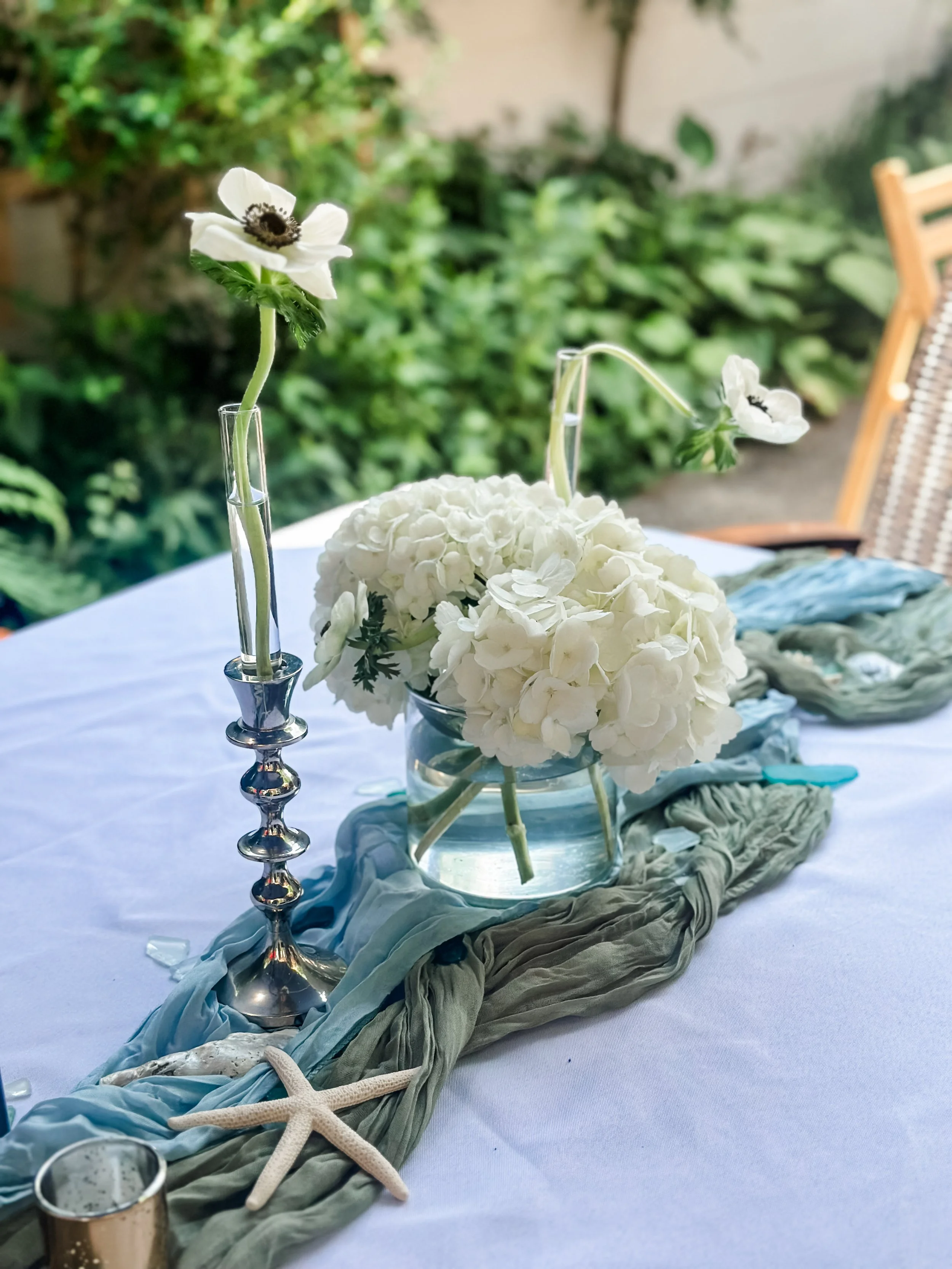 The theme was more around a color scheme and “vibe” of sea glass and hydrangeas which fit the coastal property perfectly. Tablescapes were draped in blue and green gauze with hydrangea bushels and single animones in custom test tube candlesticks throughout. We welcomed guests with a custom A-Frame sign with a watercolor print of their home and Limelight Hydrangea accents. The feature of the party was a large fish net that we strung between trees and clipped dozens of pictures throughout the past 50 years- all of family and friends, many who were at the party! Removable vinyl was used to create the “50 Years of Fun” mirror which was a perfect precursor to the display.
