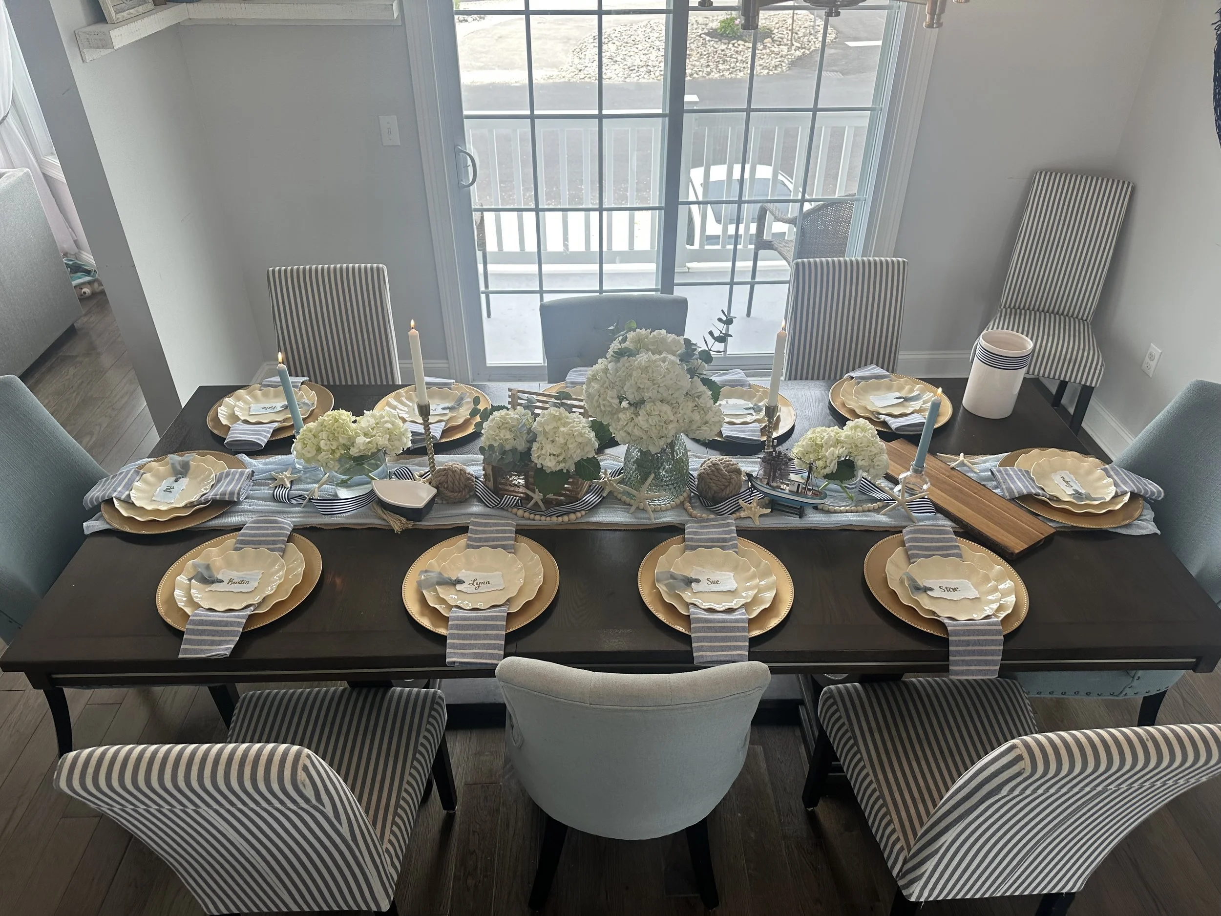 The name was inspired by the miniature lobster trap and an abundance of a hydrangeas throughout the scape. My favorite elements were the scalloped reusable plastic plates (that were— gasp, dishwasher safe!) and the cloth napkins that were affordable and amazing quality. Since we didn’t have a guest list until day-of, we ripped craft paper and water colored them ahead of time but added the names at setup.