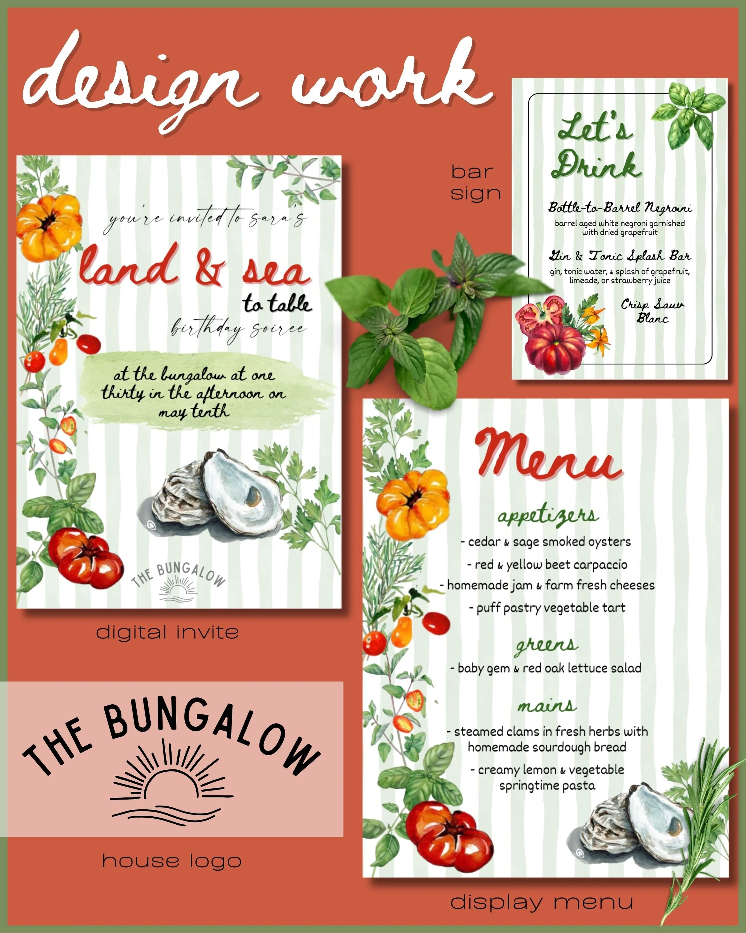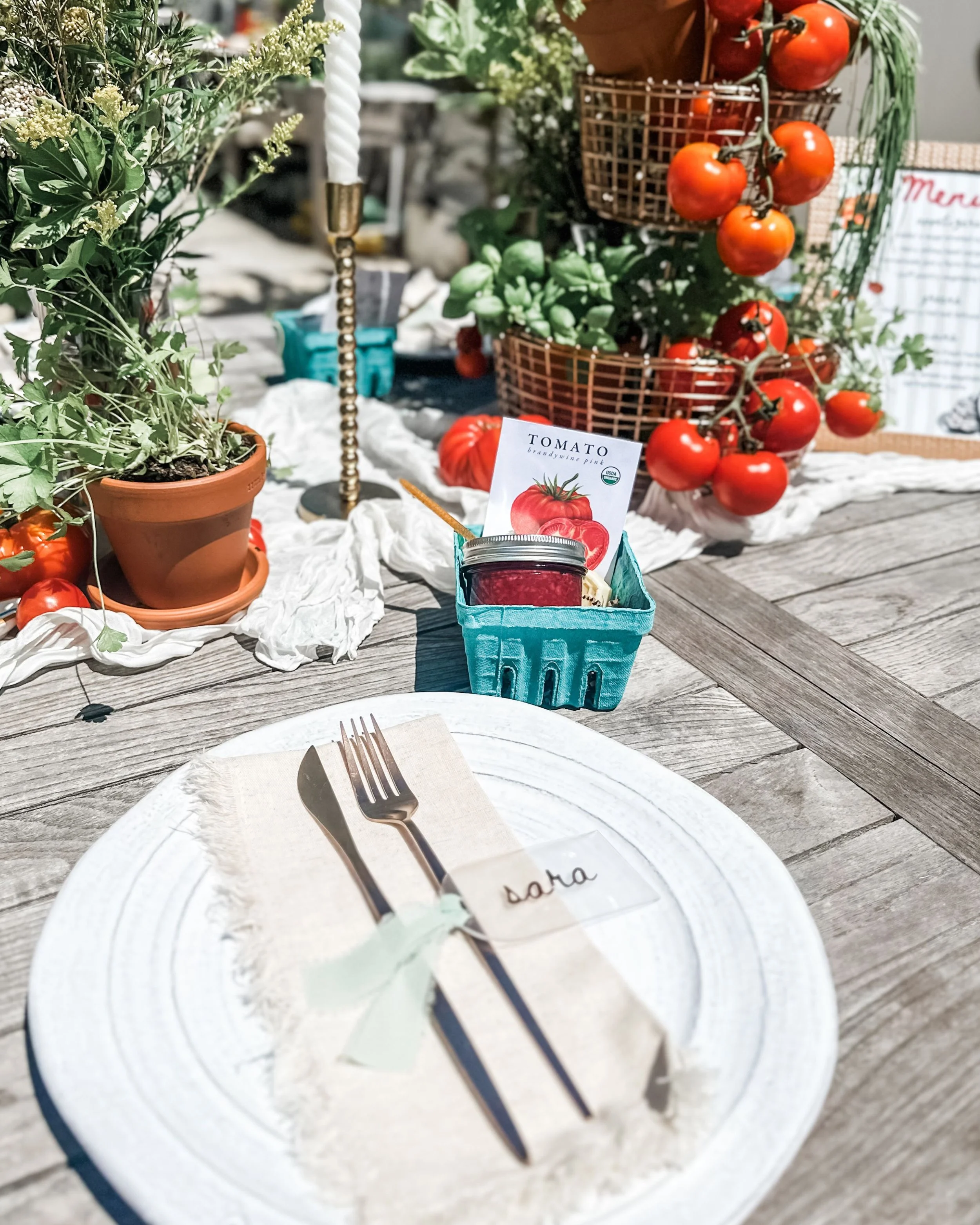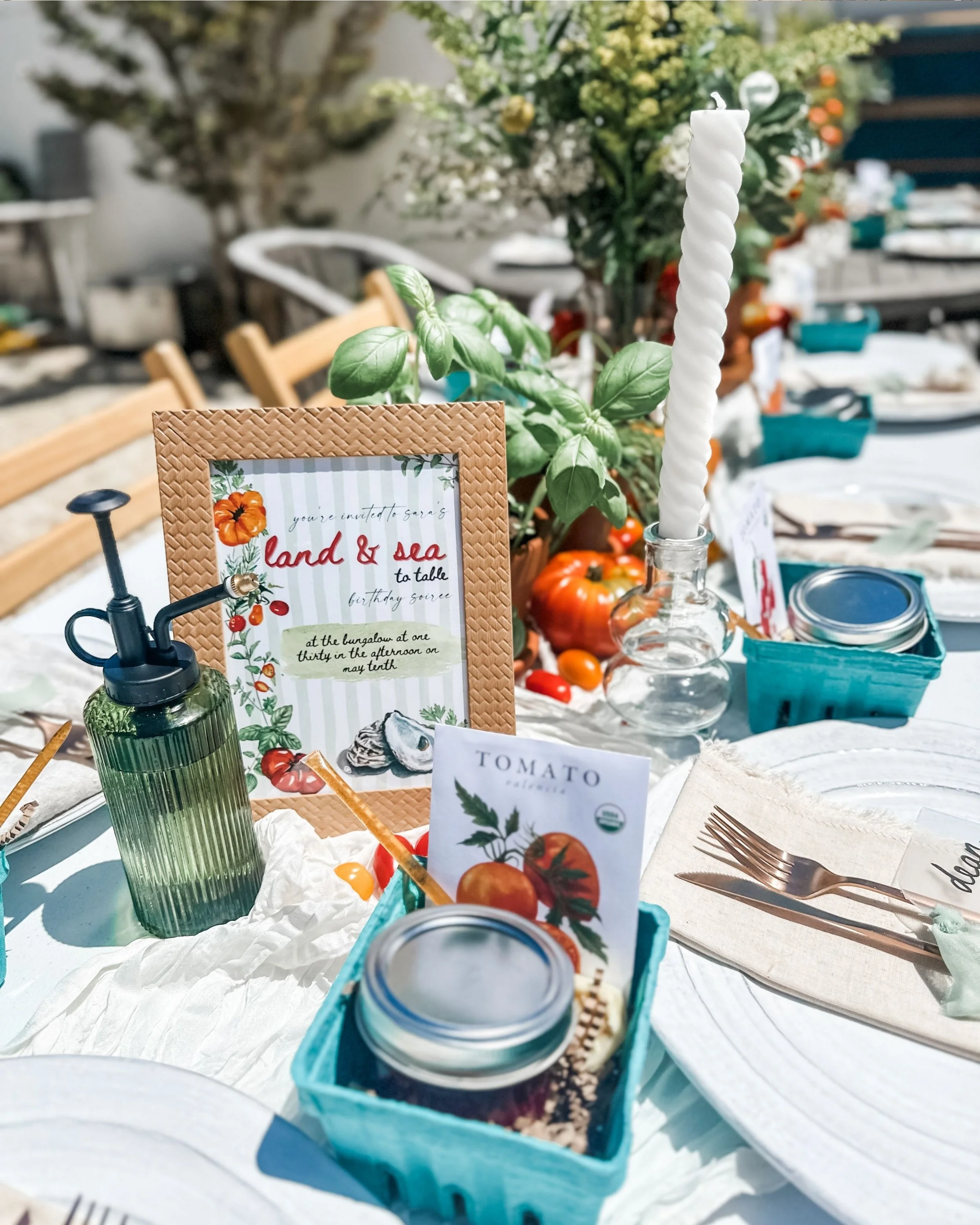 This garden party theme was so fun! It was really important to the host that it didn't look like an "Italian themed" dinner party. Incorporating pops of colors (other than red), lots of different herbs (not just basil), and some coastal elements (sardines & oysters!) helped us achieve this.